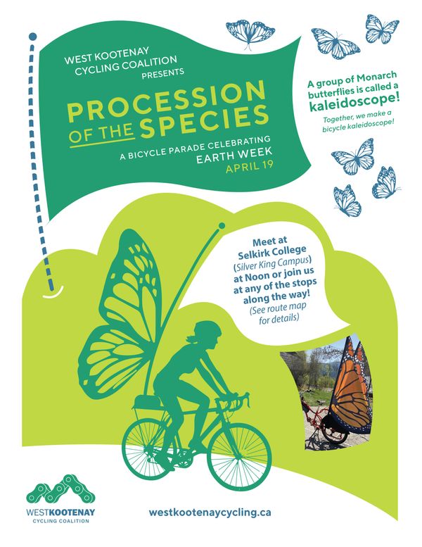 Meet at Selkirk College at noon (Silver King Campus parking lot) or join at stops along the way (see map below) . Our ride will end at Hall Street Plaza on Baker Street, in Nelson, at 1 pm where we will join the Earth Day Parade.